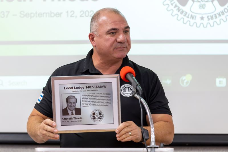 In a moving ceremony, Local 1487 President Tony Licciardi announced that Local 1487 in Chicago will be renamed in honor of retired District President Ken Thiede. The announcement was made at a meeting of the Local 1487 Retirees Club. “It is my honor, and my privilege, to present this plaque in honor of Ken,” said Local President Tony Licciardi. “Ken was a mentor, a loyal unionist, and a good friend,” he said. General Vice President Richie Johnsen paid respects to Ken in a heartfelt address to the Local. “His impact on this industry is undeniable,” he said. “Everyone who does this kind of work owes him a debt of gratitude, and profound respect.” Thiede played a central role in improving the pay and working conditions of airline employees. Over the course of his 65 years of union activism, Thiede helped cement the Machinists Union at the forefront of the commercial aviation industry. Thiede was a pivotal figure within the Machinists Union and was instrumental in improving the job conditions for union members in the commercial aviation industry. During his tenure as District President, Ken helped negotiate a series of Union contracts that directly improved the pay, working conditions, and job security for thousands of airline workers. These contracts collectively forced the entire industry to improve by igniting a de-facto bidding war between airlines in their efforts to attract new employees. Thiede’s leadership contributed to the professionalization of these roles, turning once grueling, temporary jobs into stable, career-oriented positions, greatly benefiting airline workers across the industry. Ken was at the forefront of union contracts that saw pay rates rise by a staggering 243% from the early 1990s to the year 2000. His efforts helped ensure that full-time positions became more common, with enhanced safety standards driven by stricter regulations and upgraded equipment. His work helped turn what had been physically demanding and unstable jobs into lasting careers. He served as a proud Unionist at Local Lodge 1487 since 1957, which was based in Des Plaines, Illinois, near Chicago O’Hare International Airport. Local Lodge 1487, based near O’Hare, shared similar concerns and representation within the airline industry. The memorial observance attracted a standing-room-only gathering of retirees, current members, and Machinists Union leadership from around the nation to Chicago. Present to pay respects to Ken was Richie Johnsen, General Vice President of the Air Transport Territory, Assistant General Chairmen Joe Bartz, Mike Quartuccio, Erik Stenberg, and retired District President Rich Delaney, among others. A raffle in his memory raised funds that were donated to St. Jude’s Children’s Hospital. President of the Retiree Committee in Chicago, Dave Roderick, honored Ken’s memory alongside his wife of 61 years. “His loss was painful to all of us,” he said. “But, we can take solace in the knowledge that his work is finally done.” |